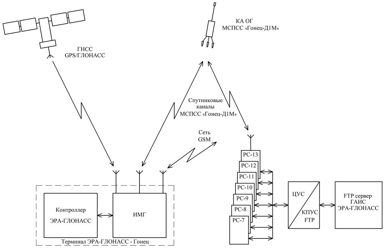 Связной комплекс МСПСС «Гонец Д1М» является многофункциональной системой, использующей спутниковые и сетевые технологии, и состоит из сложных комплексов, каждый из которых выполняет определённые функции, совместно обеспечивающие предоставление услуг связи. В состав связного комплекса входят: - базовая сеть обмена данными (БСОД); - автоматизированная система управления связного комплекса; - наземные средства пользователей (функционально).
